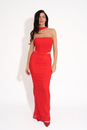 Maxi Εφαρμοστό Φόρεμα Με Ανοιχτή Πλάτη ,Τιράντες Διακοσμημένο Με Βολάν Στοιχεία Και Λουλούδι Στο Μπούστο -Κόκκινο