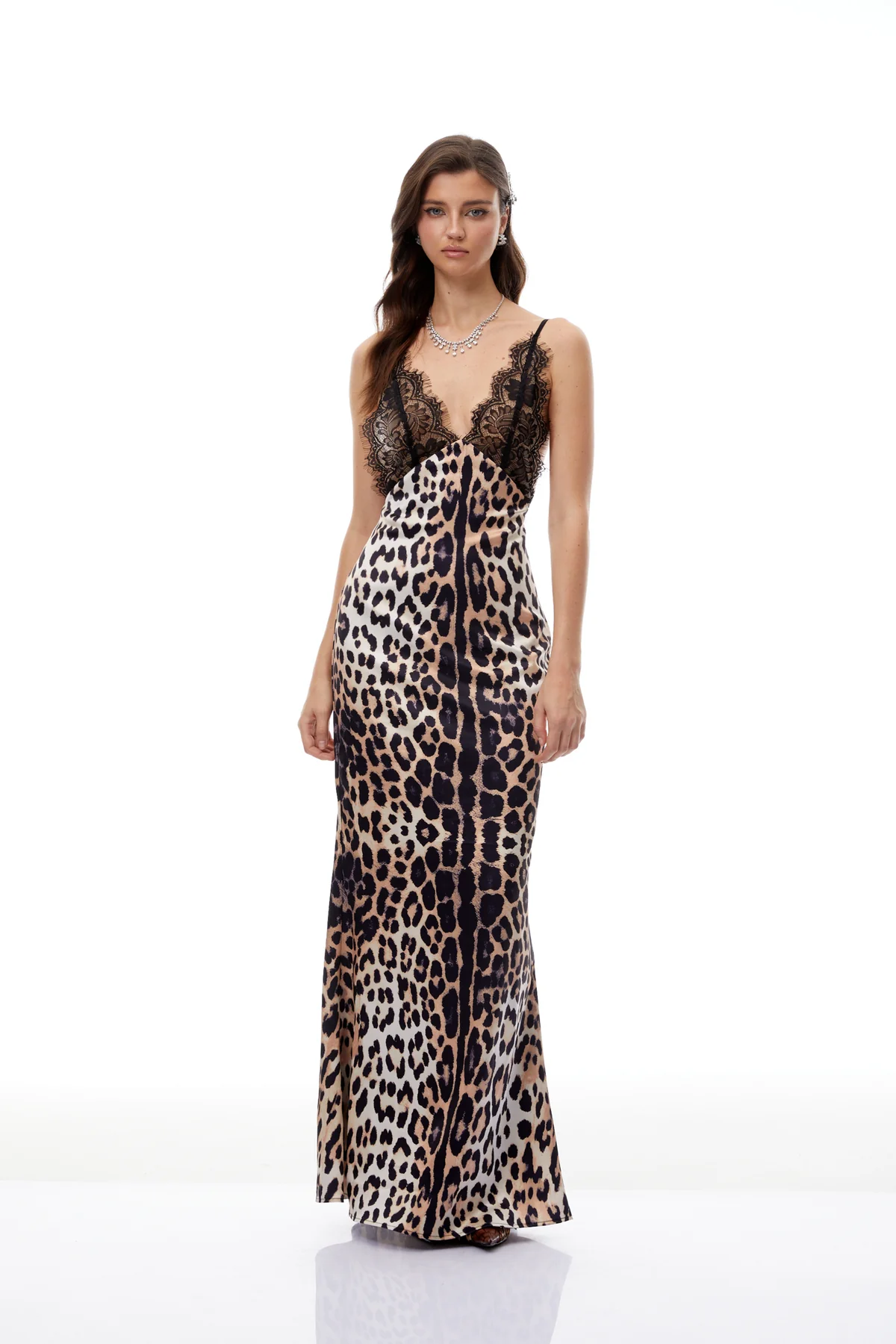 Maxi Leopard Dress With Straps Decorated With See-Through Lace At The Bust