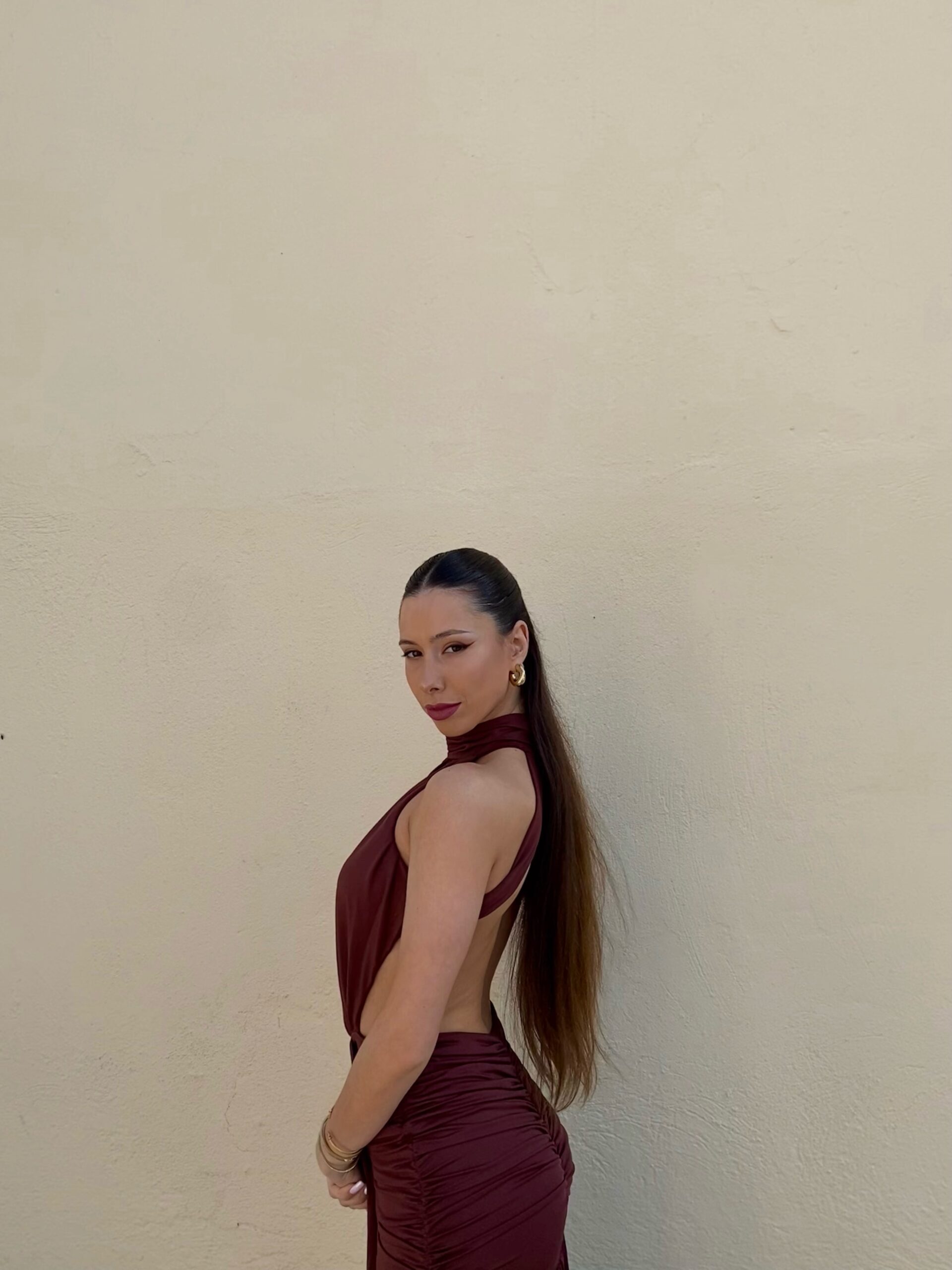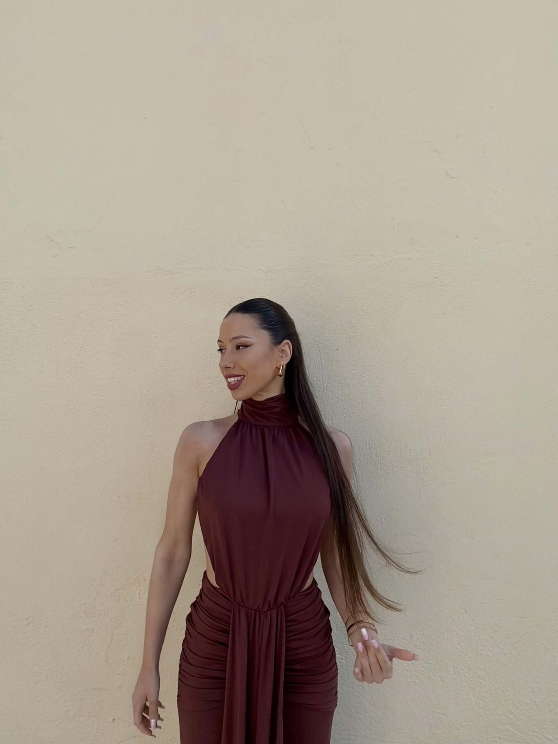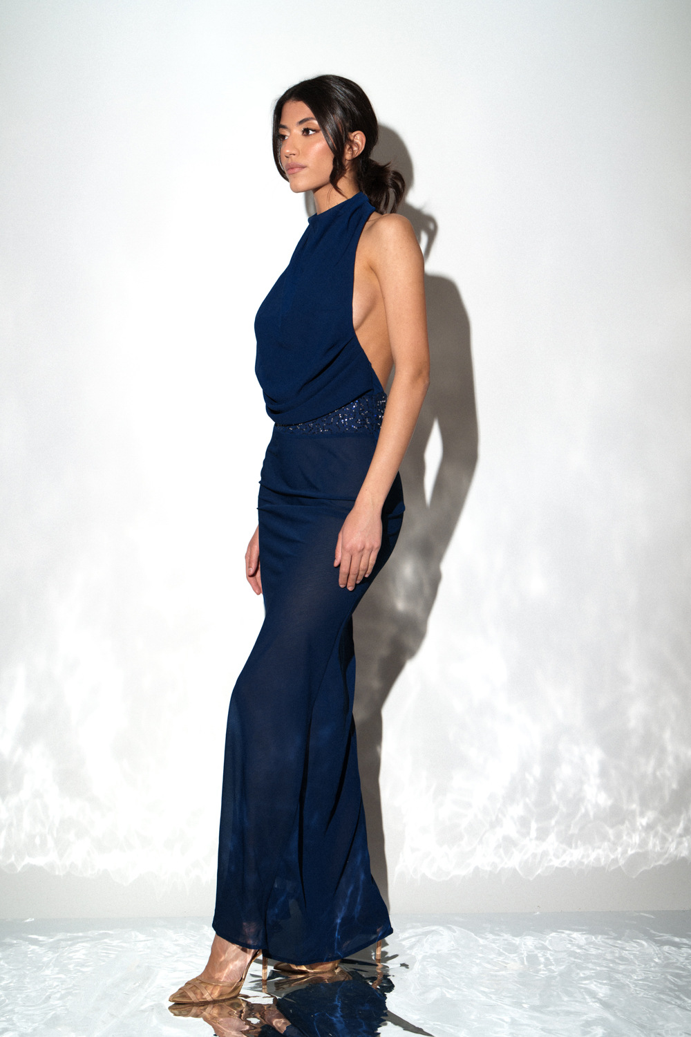 Maxi Draped Dress With Crisscross Straps Decorated With Gold Metallic Details
