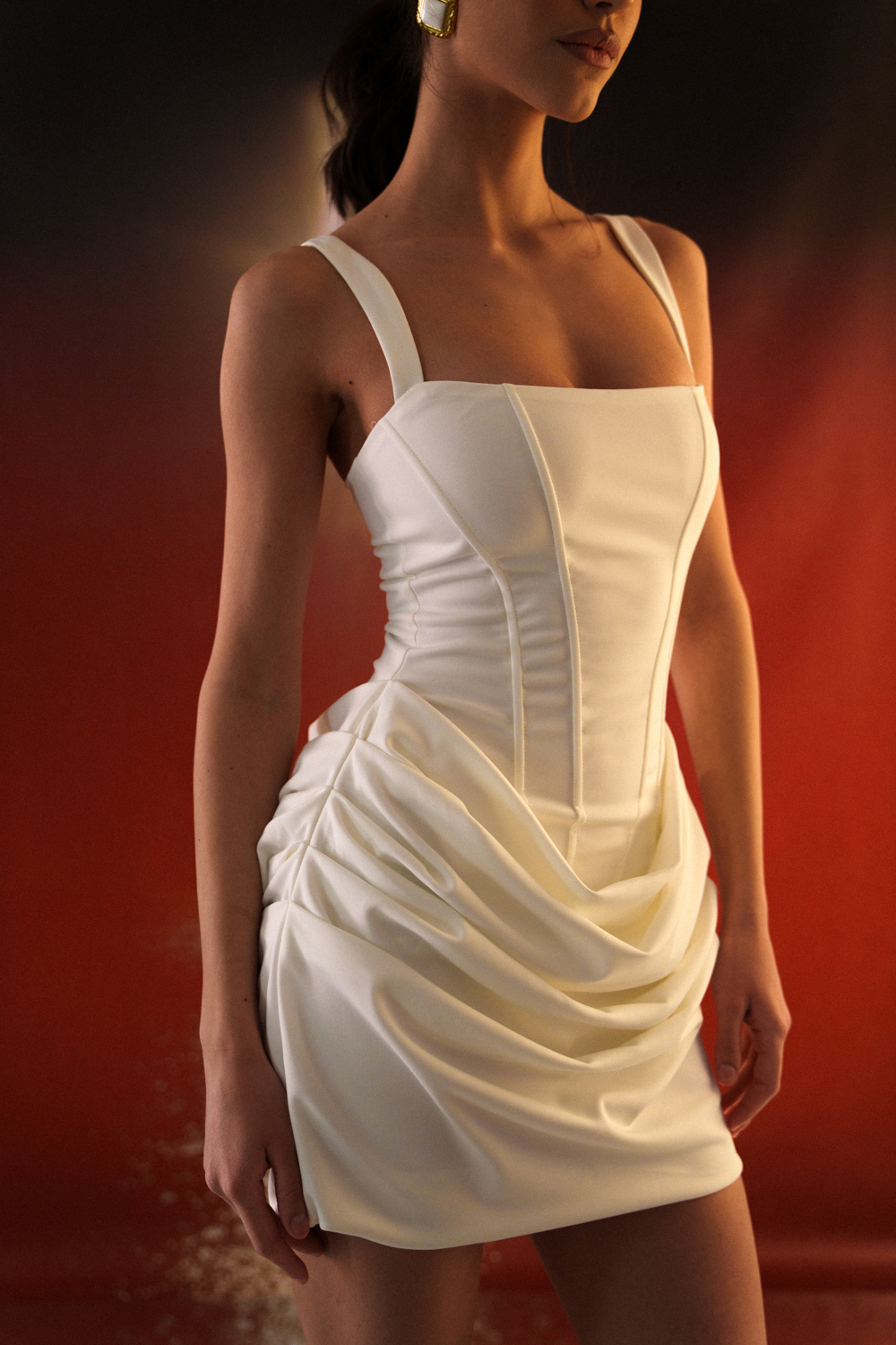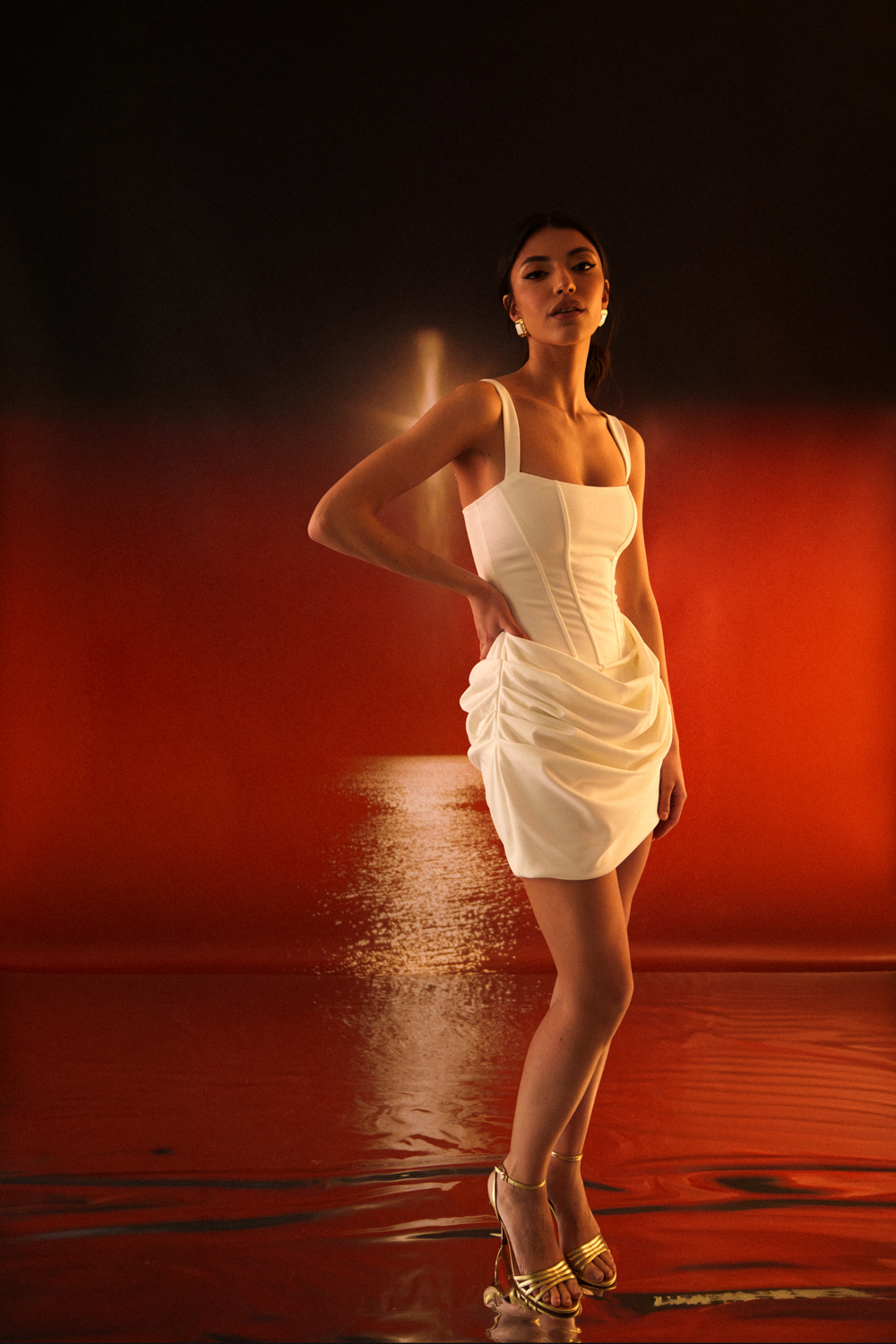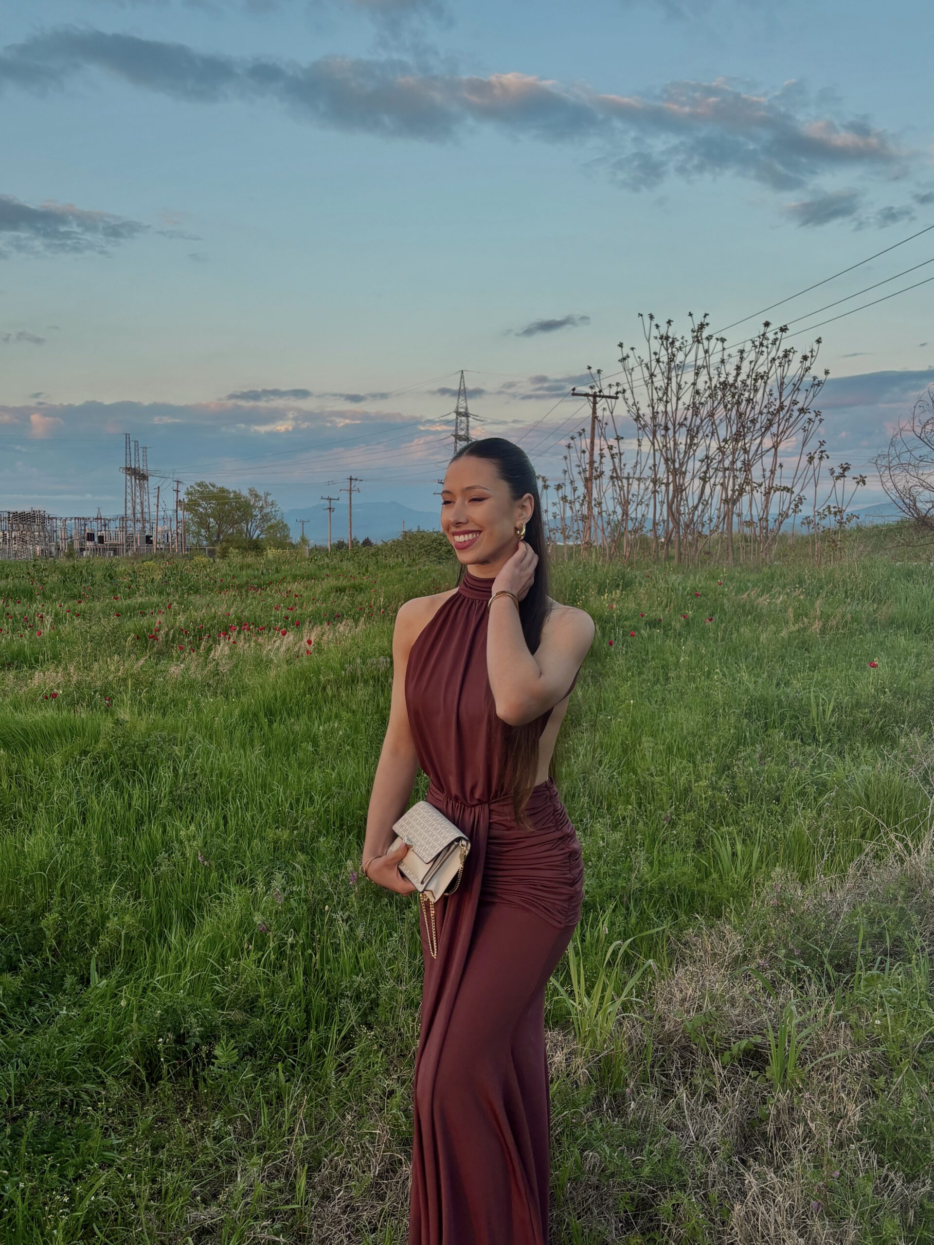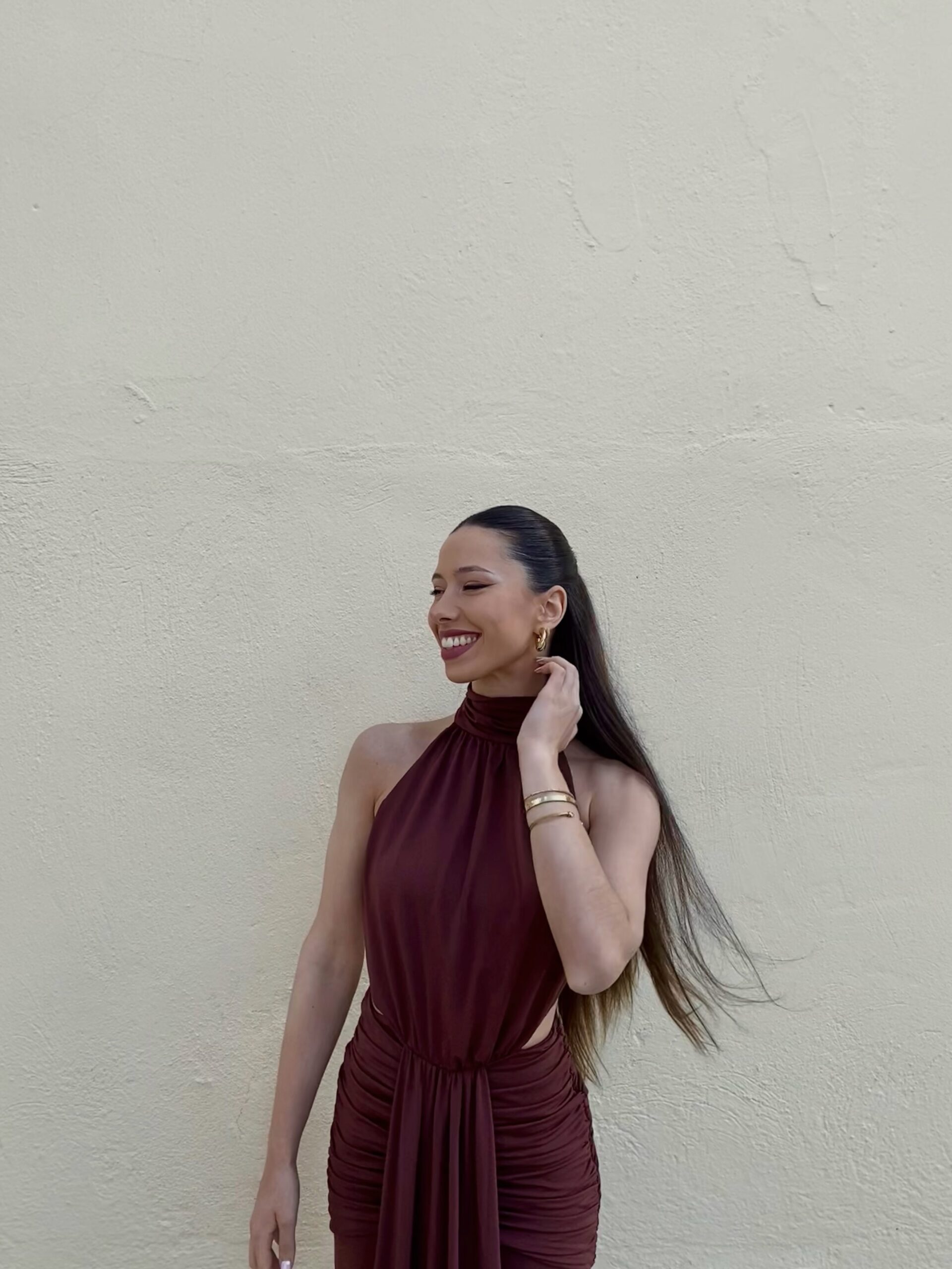 Maxi Draped Dress With Crisscross Straps Decorated With Gold Metallic Details