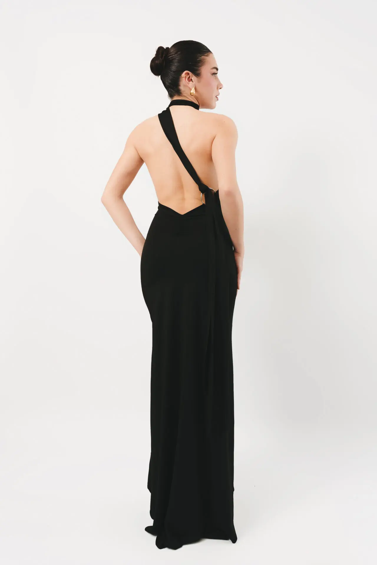 Maxi Long Sleeve Dress With Open Back, Tie Neck And Wave Effect