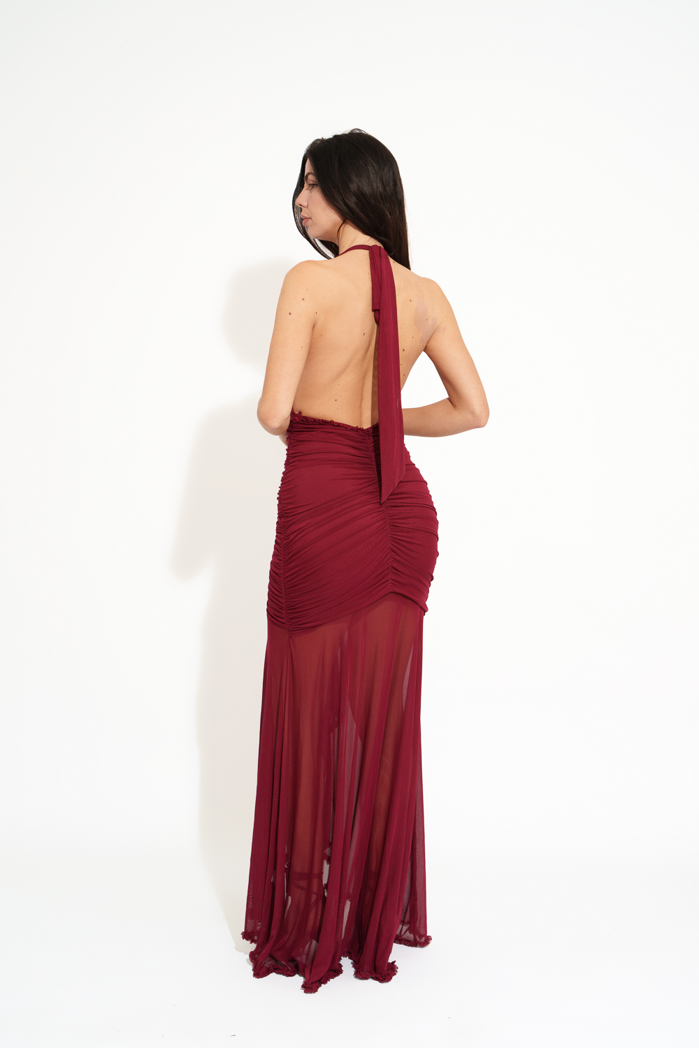 Maxi Tie Draped Dress With Deep Neckline And Tulle Ruffles Details