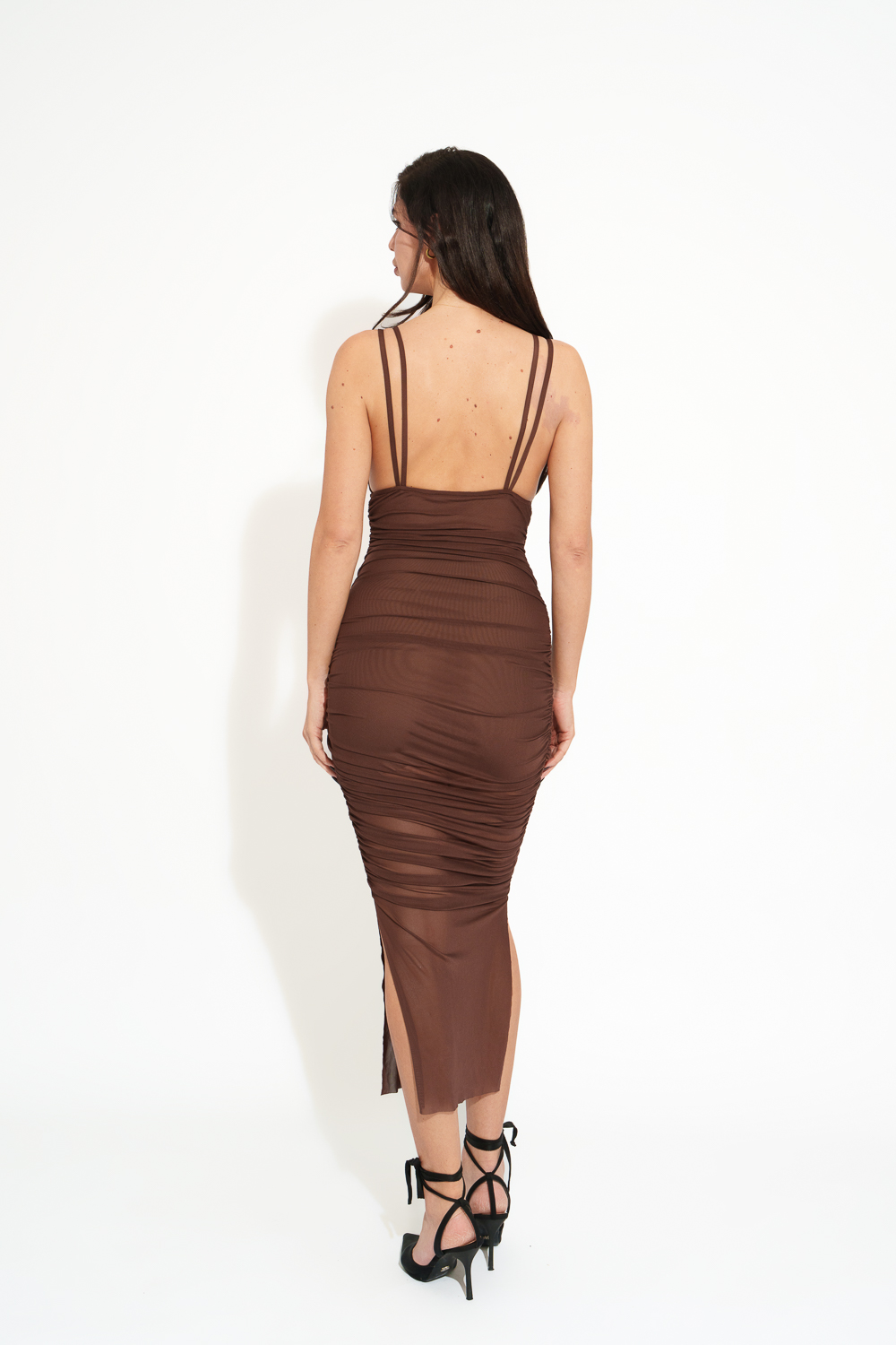 Maxi Tie Draped Dress With Deep Neckline And Tulle Ruffles Details
