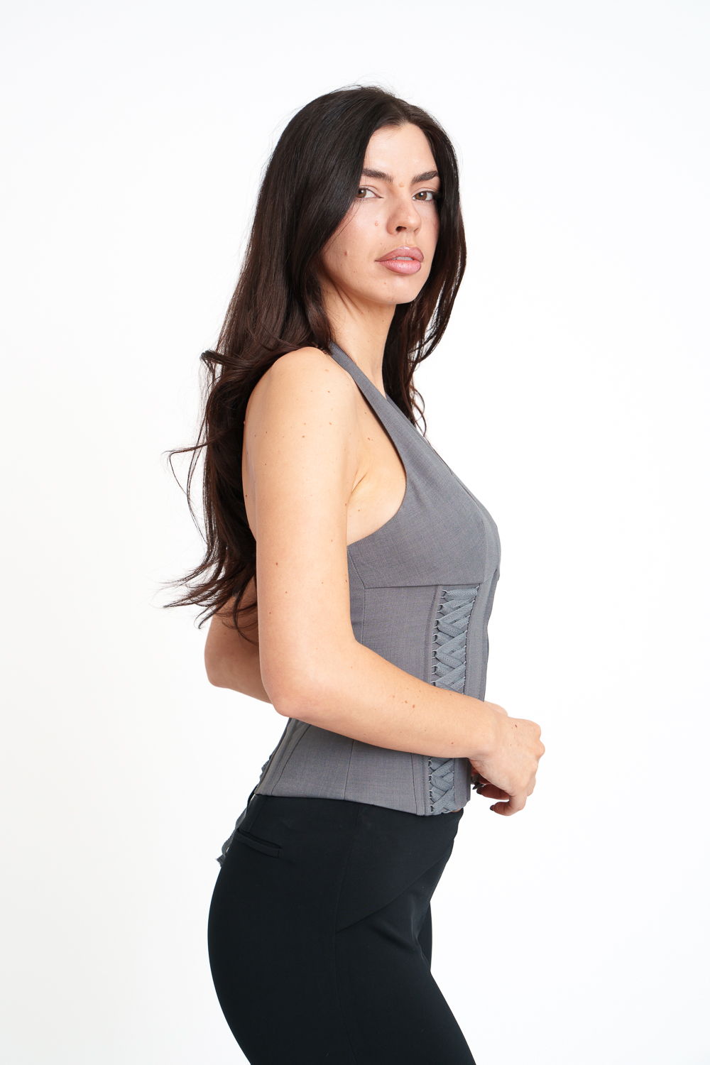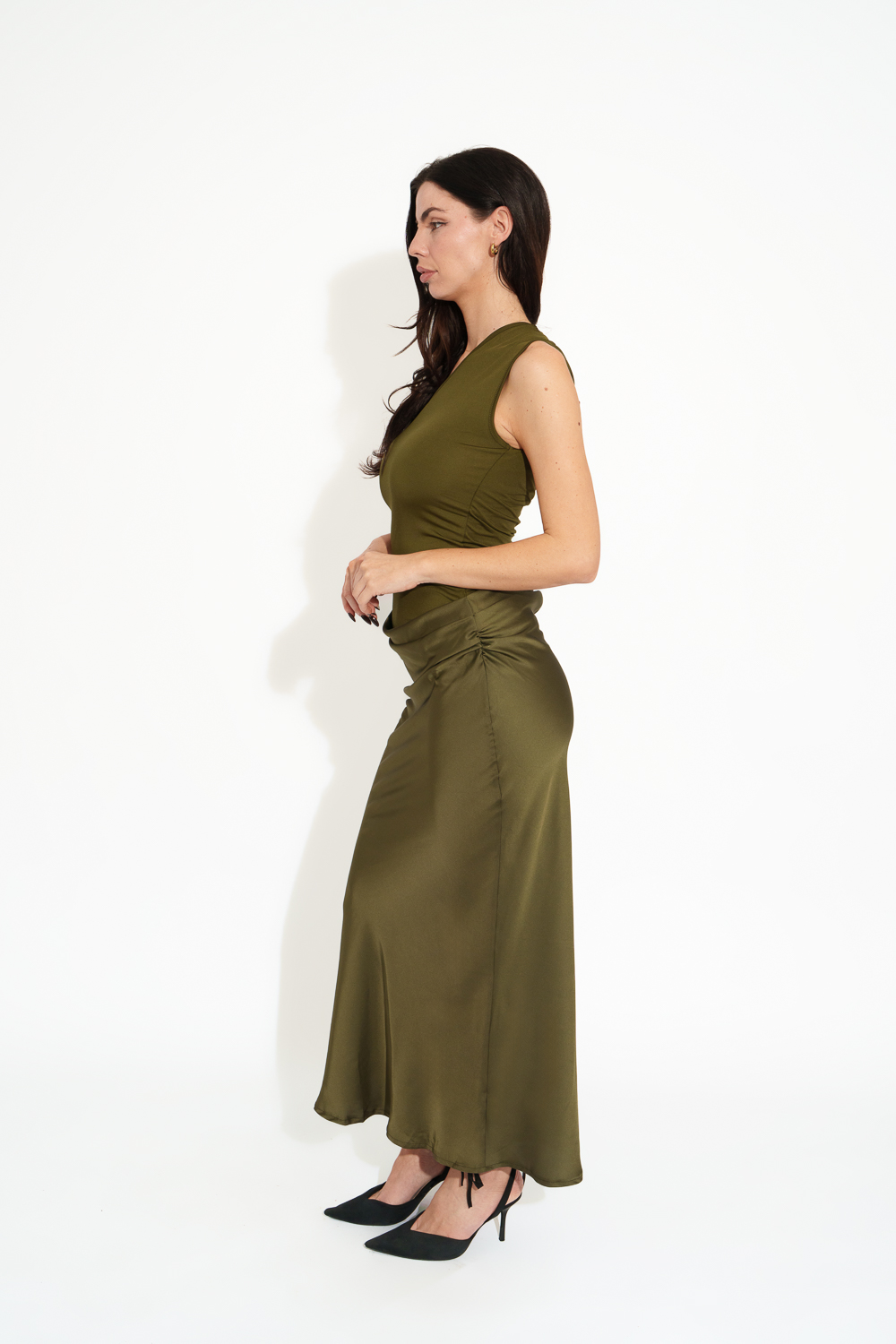 Fitted at the bust, mid-length with a soft texture