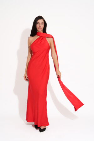 Maxi Σατέν Φόρεμα Δετό Στο Λαιμό Με Κορδόνια Και Φουλάρι – Κόκκινο