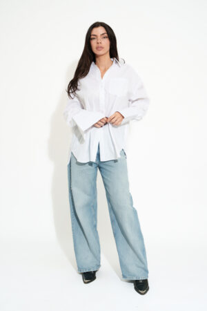 Διαθέτει διάτρητες λεπτομέρειες στο τελείωμα του φορέματος και των μανικιών