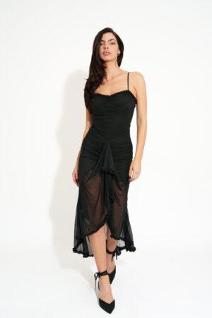 Maxi Ασύμμετρο Φόρεμα Με Τιράντες Και Λεπτομέρεια Βολάν Στους Γλουτούς – Μαύρο